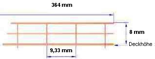 Reling, Geländer, 1:150, 3 Durchz., L=364 mm, H=8 mm, Kupfer geätzt. 1 Handlauf und 2 Fußleisten. Abstand zwischen den einzelnen Stützen=9,33 mm VK-Einh. 1 Satz = 2 Stück