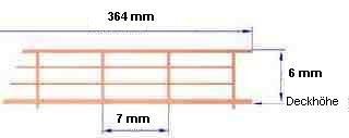 Reling, Geländer für Modellschiffe, 1:200, 4 Durchz., L=364 mm, H=6 mm, Kupfer geäzt. 1 Handlauf und 3 Fußleisten. Abstand zwischen den einzelnen Stützen=7 mm VK-Einh. 1 Satz = 3 Stück