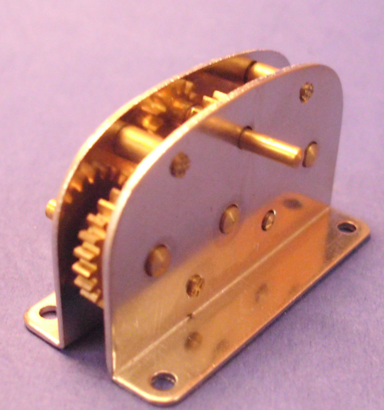 Schiffs Doppel-Getriebe zum Antrieb v. 2 gegenläufigen Schraubenwellen mit einem Motor, Achsabstand 25 mm, Schiffs Doppel-Getriebe ausd Messing zum Antrieb v. 2 gegenläufigen Schraubenwellen mit einem Motor, Achsabstand 25 mm, 5 Messingzahnräder bewirken die Überstzung. VK-Einheit = 1 Stück